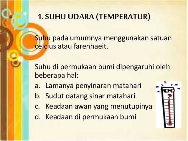 Suhu udara di suatu tempat akan berbeda dengan tempat lainnya disebabkan oleh beberapa faktor yaitu. Cuaca Iklim dan Musim. Berdasarkan pemaparan pengertian cuaca sebelumnya beberapa unsur iklim adalah sebagai berikut.