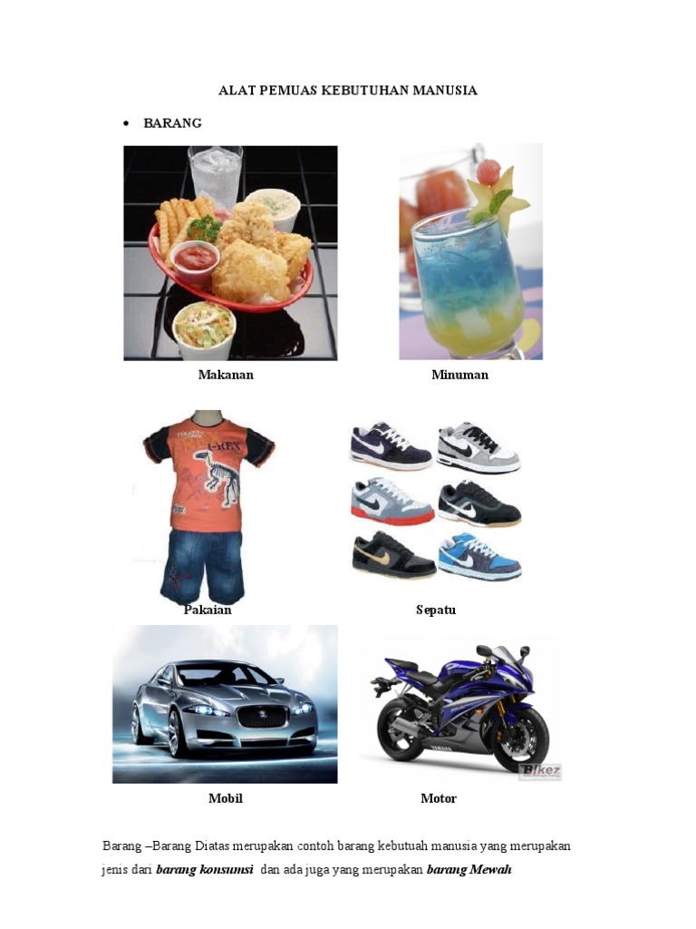 Alat Pemuas Kebutuhan Manusia Barang yakni berbagai benda-benda berwujud yang digunakan masyarakat untuk memenuhi kebutuhan hidupnya. Berbagai benda berwujud fisik yang digunakan masyarakat untuk memenuhi kebutahan hidup mereka. Misalnya rumah makanan sepeda motor mobil dan perhiasan. Mengapa alat pemuas kebutuhan sifatnya terbatas.