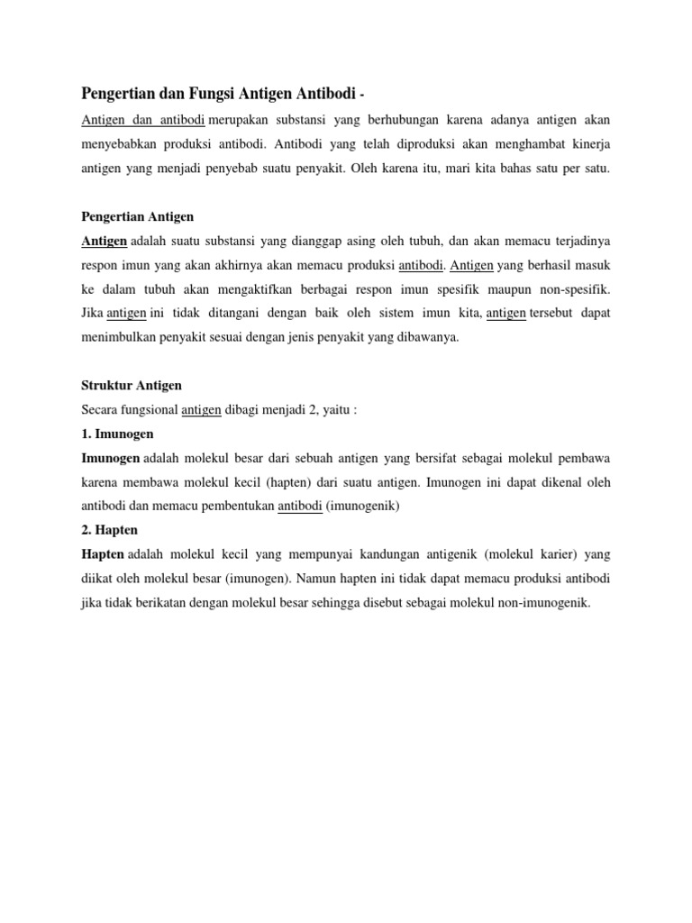 Antigen merupakan suatu zat atau benda asing misalnya seperti racun kuman atau virus yang bisa masuk ke dalam tubuh manusia. Ketika antigen melekat pada reseptor sel imun seluruh tubuh akan bekerja sama untuk mengenali antigen dan memberikan sinyal untuk. Antigen adalah benda atau zat asing yang bisa masuk ke dalam tubuh termasuk virus racun atau kuman. Benda-benda asing yang masuk ke dalam tubuh manusia akan dianggap sebagai antigen oleh tubuh yang akan menstimulasi aktifitas antibody.