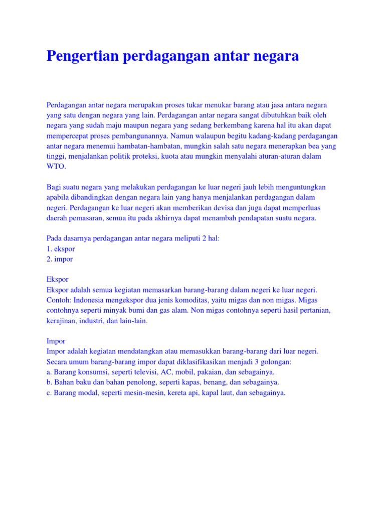 Diambil dari jurnal Tinjauan Prosedur Pengiriman Ekspor Karet 2014 karya Febri Yunanda perdagangan internasional adalah perdagangan yang dilakukan antar negara atau pemerintah negara dengan negara lain. Apa yang Dimaksud Dengan Globalisasi Secara Umum. Perdagangan antardaerah atau antarpulau merupakan perdagangan yang dilakukan oleh penduduk lembaga suatu daerah atau pulau dengan penduduklembaga suatu daerah atau pulau lain dalam satu batas wilayah negara atas dasar kesepakatan bersama. Jadi apa yang dimaksud dengan keberagaman adalah suatu keadaan dimana terdapat perbedaan dalam berbagai bidang.
