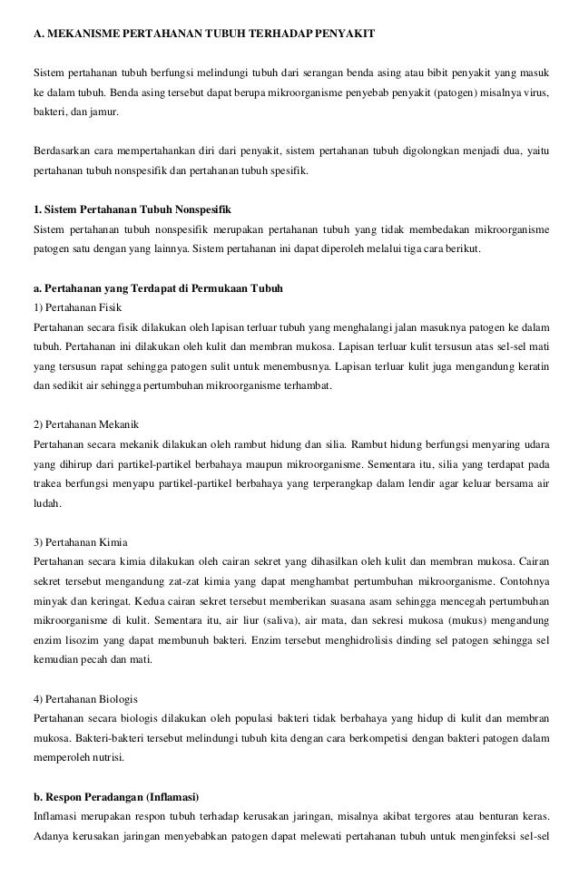 Apakah yang dimaksud dengan sistem pertahanan tubuh. Ketika istirahat hampir semua jantung dengan mudahnya memompa lebih dari 5 liter darah ke seluruh tubuh setiap menitnya. Pertahanan tubuh nonspesifik bekerja dengan menyerang segala macam antigen yang masuk ke dalam tubuh. Antibodi atau imunoglobulin melayani fungsi independen dan dengan mengaktifkan respons efektor dan sekresi yang dimediasi sel. Apa saja gangguan sistem pertahanan tubuh.