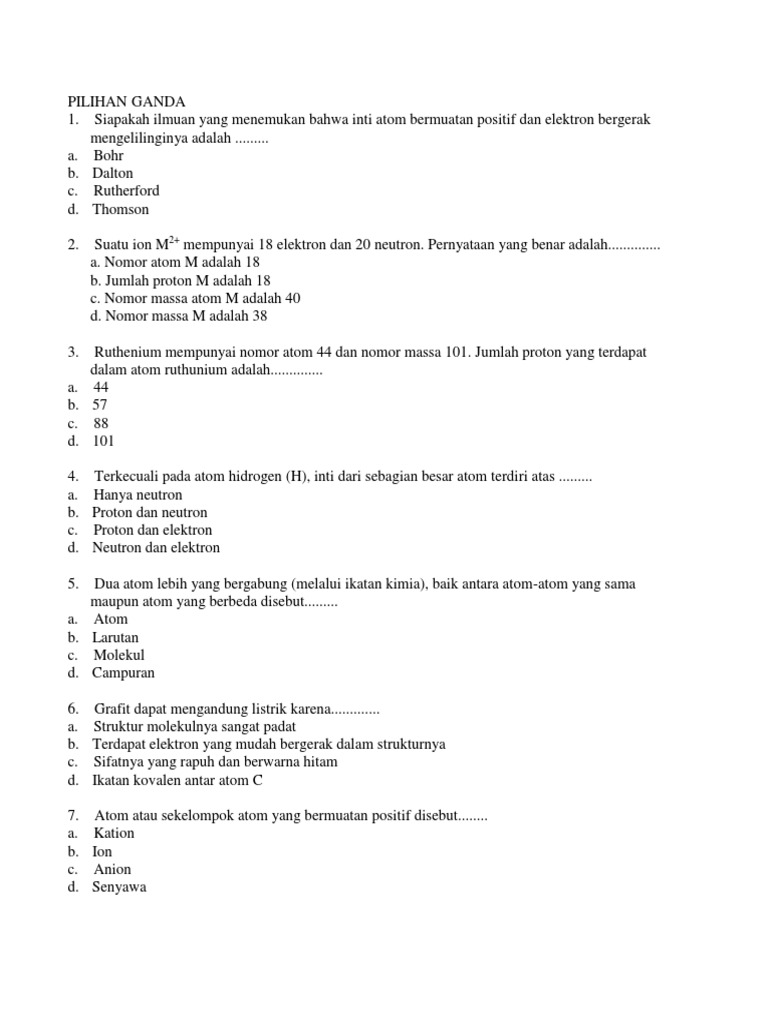 Atom sebagai bola masif bermuatan positif yang di dalamnya tersebar elektron sehingga keseluruhannya bersifat netral. Sebuah atom bisa kehilangan satu atau lebih elektronnya atau mendapatkan elektron. Ion merupakan atom atau gabungan beberapa atom yang mempunyai muatan listrik positif atau negatif. Atom yang mengandung jumlah proton dan elektron yang sama bersifat Netral sedangkan yang mengandung jumlah proton dan elektron yang berbeda bersifat positif atau negatif dan disebut sebagai IonStruktur Atom merupakan satuan dasar materi yang terdiri dari inti atom beserta awan elektron bermuatan negatif yang mengelilinginyaIstilah atom.