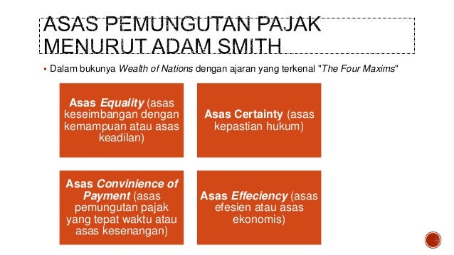 313 Asas Pengenaan Pajak Menurut Resmi 2014. Asas-Asas Pemungutan Pajak Menurut Adam Smith - Pajak merupakan penerimaan negara yang digunakan untuk mengarahkan kehidupan masyarakat menuju kesejahteraan. Menurut teori ini justifikasi pemungutan pajak terletak pada efek atau akibat pemungutan pajak. Penetapan pajak harus transparan dan sesui dengan hukum yang berlaku yaitu berupa Undang-undang yang berlaku di setiap negara.