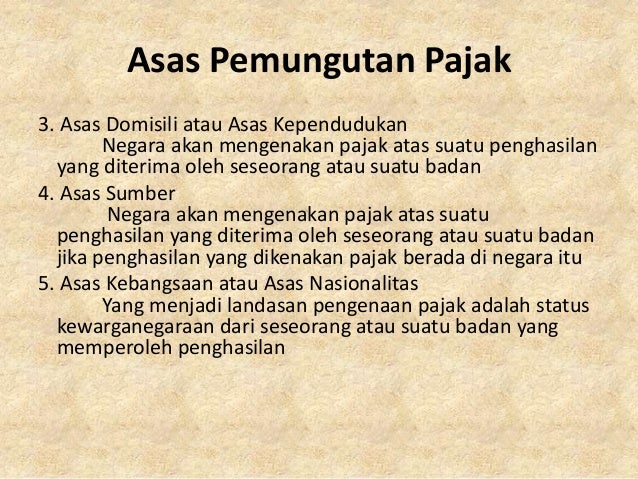 Karenanya kita sebagai warga negara yang baik wajib untuk membayar pajak tahunan sebagai bentuk tanggung jawab kita pada negara. 10 azaz pemungutan pajak yaitu. Azas Domisili azas tempat tinggal Yaitu negara berhak mengenakan pajak atas seluruh penghasilan wajib pajak yang bertempat tinggal di wilayahnya baik penghasilan yang berasal dari dalam maupun dari luar negeri. Maka akan dihasilkan suatu akuntansi pajak yang menjadi dasar untuk.