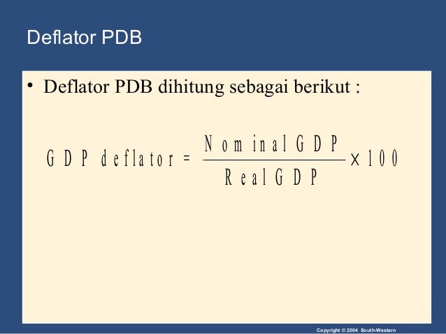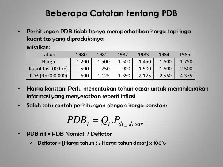 Dengan indikator PDB pertumbuhan ekonomi dapat dihitung menggunakan formulasi sebagai berikut. Dalam perhitungannya termasuk juga hasil produksi dan jasa yang dihasilkan oleh perusahaanorang asing yang beroperasi diwilayah yang bersangkutan. Sebelumnya mari kita definisikan apa itu PDB. Untuk mendapatkan PDB riil anda memerlukan indikator ketiga yakni deflator PDB.