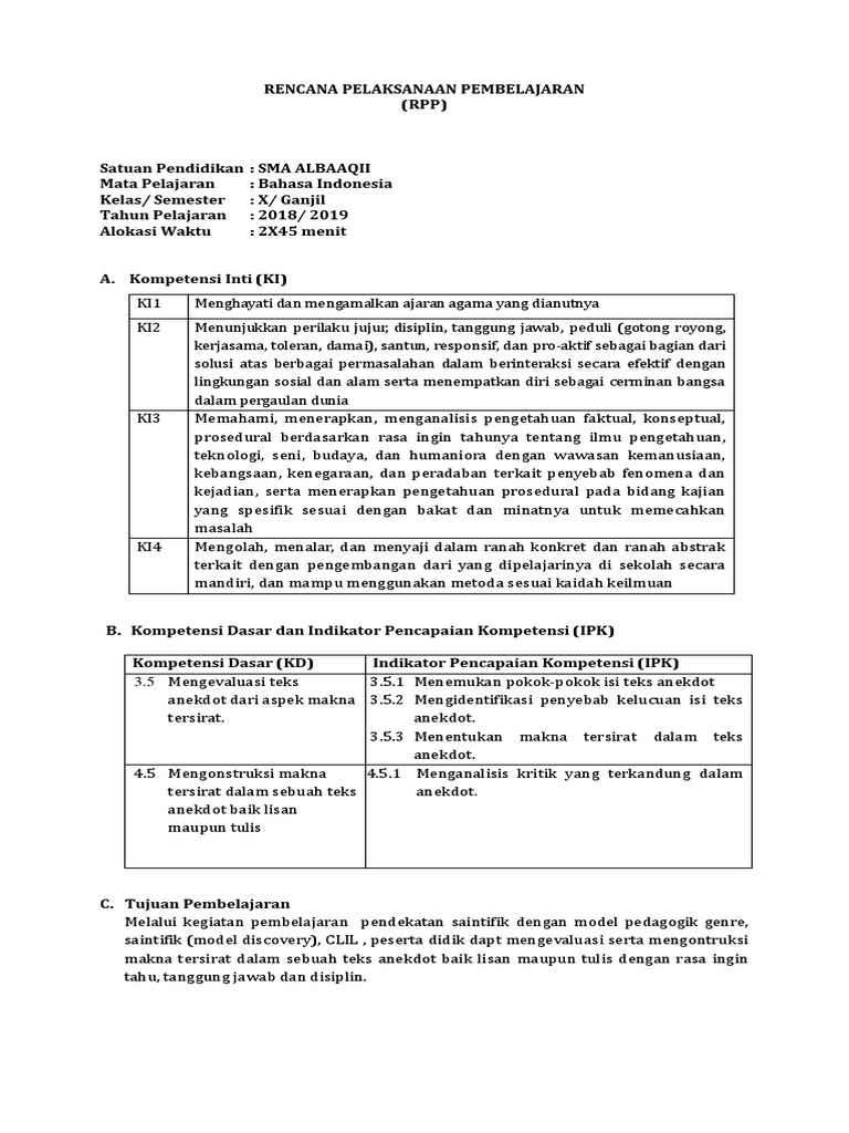 Doc Rencana Pelaksanaan Pembelajaran Teks Anekdot K13 Hidayatul Ilmiah Academia Edu