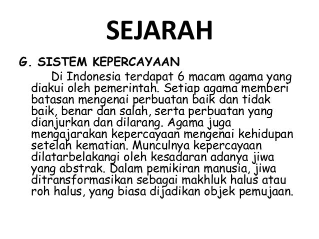 Sistem kepercayaan atau bayangan-bayangan manusia tentang bentuk dunia alam alam gaib hidup dan maut. Sistem kepercayaan masyarakat Indonesia zaman praaksara diperkirakan tumbuh pada masa berburu dan mengumpulkan makanan. Sistem Kepercayaan manusia purba pada masa pra-aksara bisa dikategorikan menjadi tiga jenis yaitu. Kata animisme berasal dari bahasa Latin anima yang memiliki arti roh.