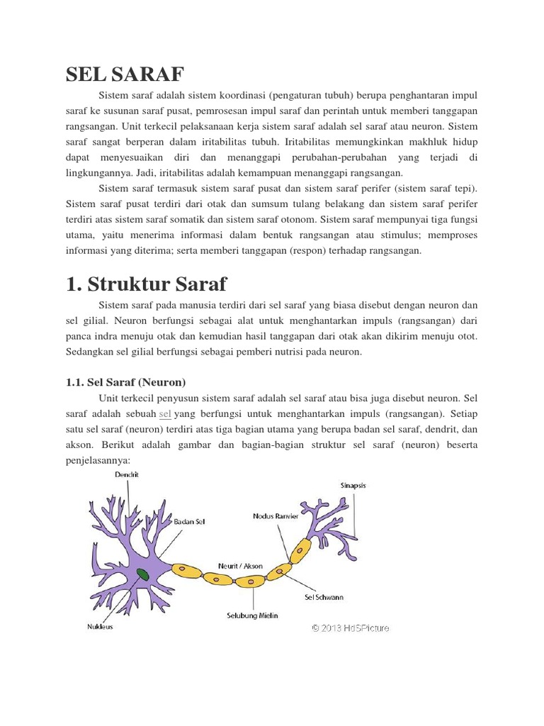 Sel Saraf atau yang biasa disebut juga sebagai neuron adalah bagian tubuh yang berfungsi sebagai penghantar rangsang. Neuron merupakan sel yang khusus untuk melewatkan sinyal ke sel target individual dan sinapsis merupakan sarana yang mereka lakukan. Dendrit berfungsi mengirimkan impuls ke badan sel saraf sedangkan akson berfungsi mengirimkan impuls dari badan sel ke sel saraf yang lain atau ke jaringan lain. Bagian dari akson yang tidak terbungkus mielin disebut nodus Ranvier yang dapat mempercepat penghantaran impuls.