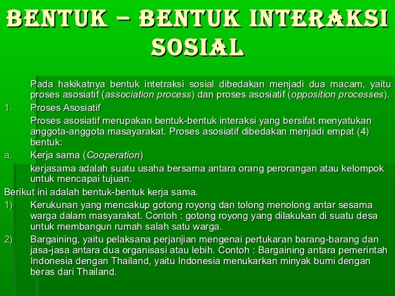 VII - 3 SMP NEGERI 8 SAMARINDA A. GridKidsid - Ada dua bentuk interaksi sosial dalam masyarakat Kids yaitu proses asosiatif dan disosiatif. Bentuk-bentuk interaksi sosial adalah. Kerja sama cooperation- bentuk utama dari proses interaksi sosial karena pada dasarnya interaksi sosial yang dilakukan oleh seseorang bertujuan untuk memenuhi kepentingan atau kebutuhan bersama.